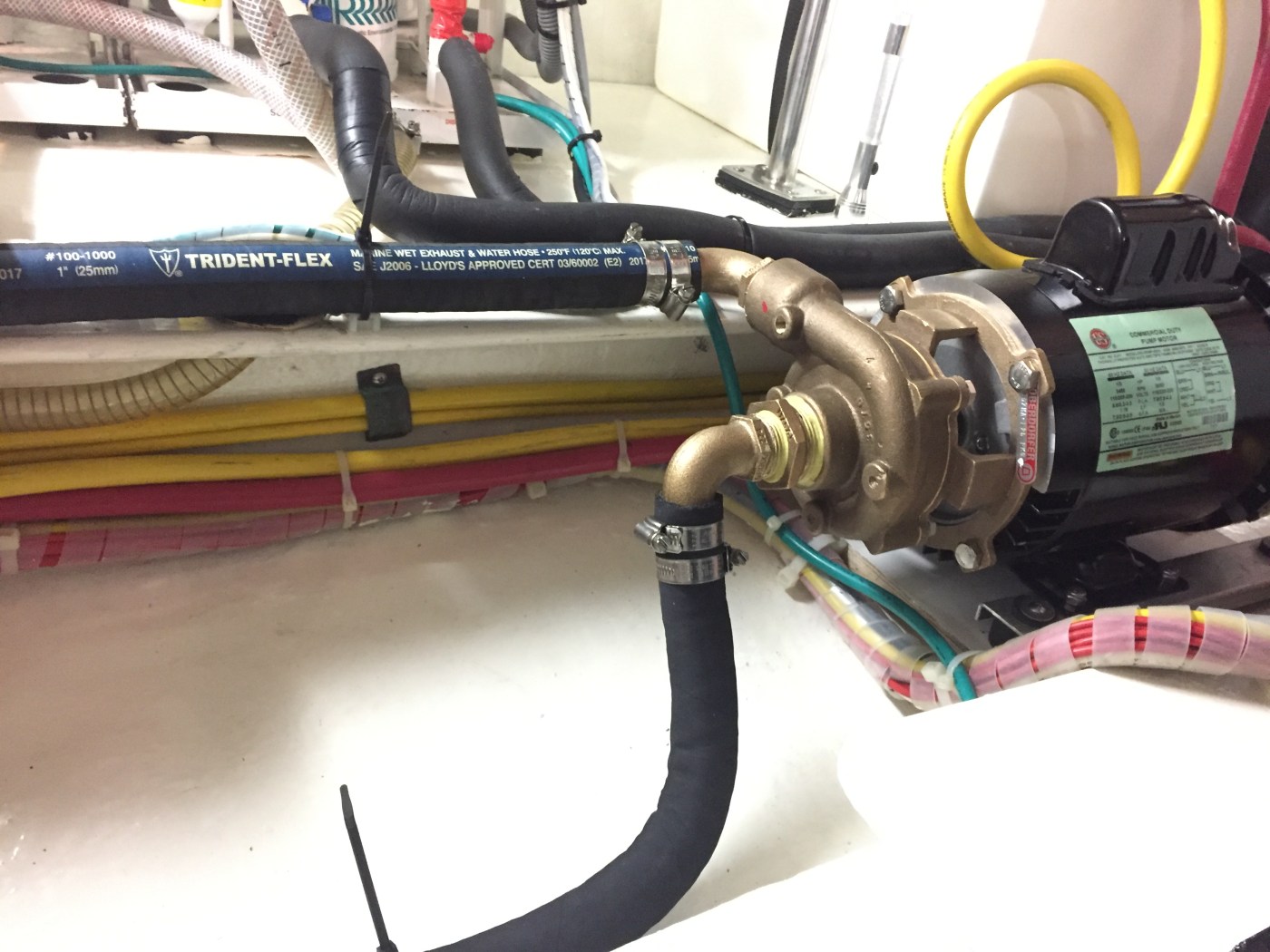 With the rainy and windy weather, I have plenty of time to work on projects. This week I replaced the cooling pump and raw water hoses attached to it. The cooling pump draws sea water and pumps it through the three reverse cycle AC/heat units, then over the side. It was showing signs of corrosion on one of the fittings that could cause it to eventually fail. The hoses are seven years old and could have lasted awhile longer, but removing them from the pump required destroying three inches at each attachment point in order to get them off. Then they wouldn’t be long enough, so I replaced them.