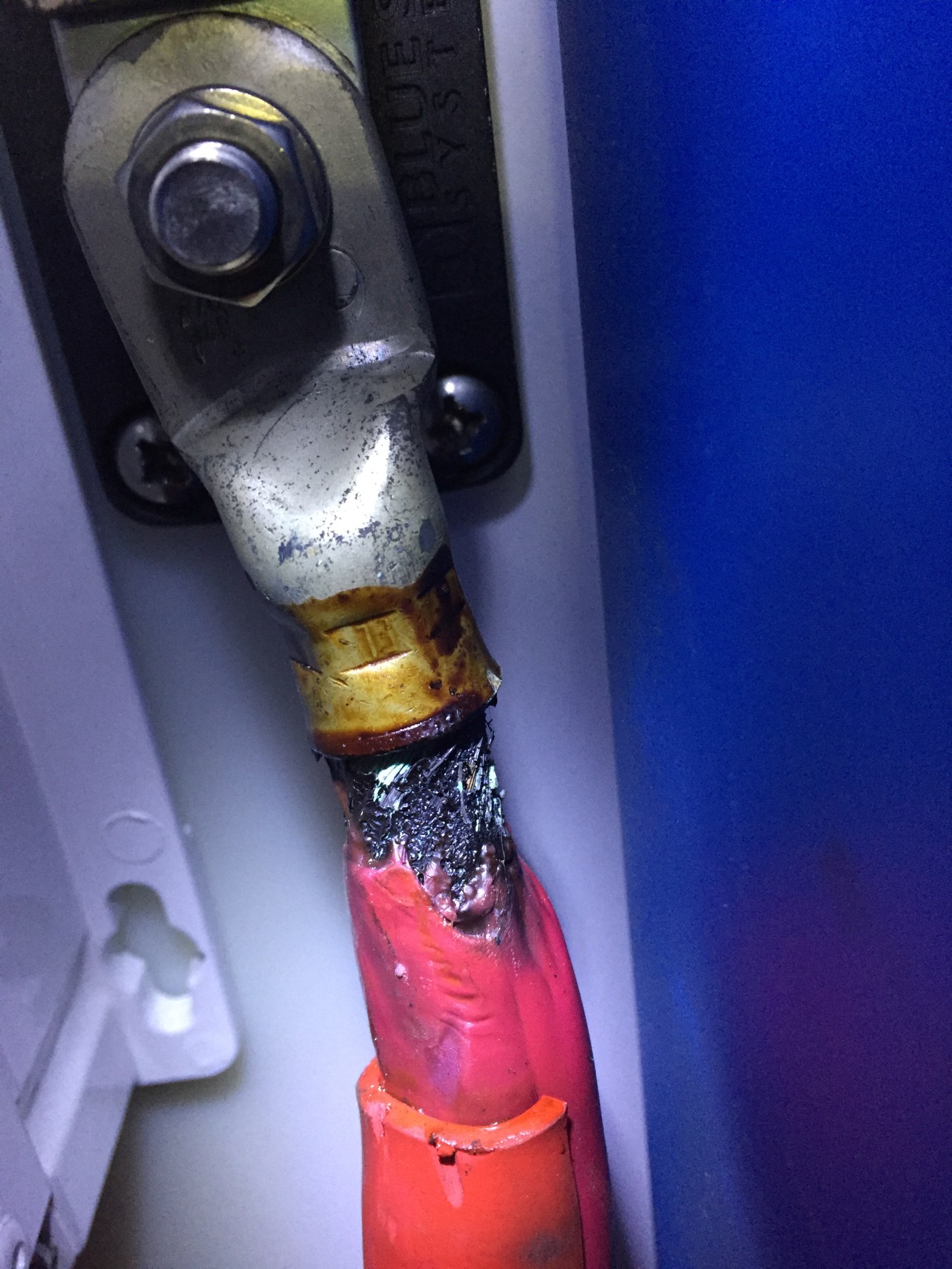 Wires are sized based on the amps that will flow through them, and the length of the wire run. If the load is heavier than the wire can handle, it will get very hot and potentially cause a fire. Fuses and circuit breakers are used to protect the wiring. So when an appropriately sized wire somehow gets short circuited or gets too heavy of an electrical load, the fuse breaks or the circuit breaker trips to shut it down. That all assumes the connections are sound. However, I found out the hard way that when a connection is made with a weak or poorly made wire crimp, a heavy load that the wire can typically handle creates resistance and thus heat. The heating only makes the connection worse and the situation escalates itself. That is what happened to Fiddler’s inverter cable as seen below.