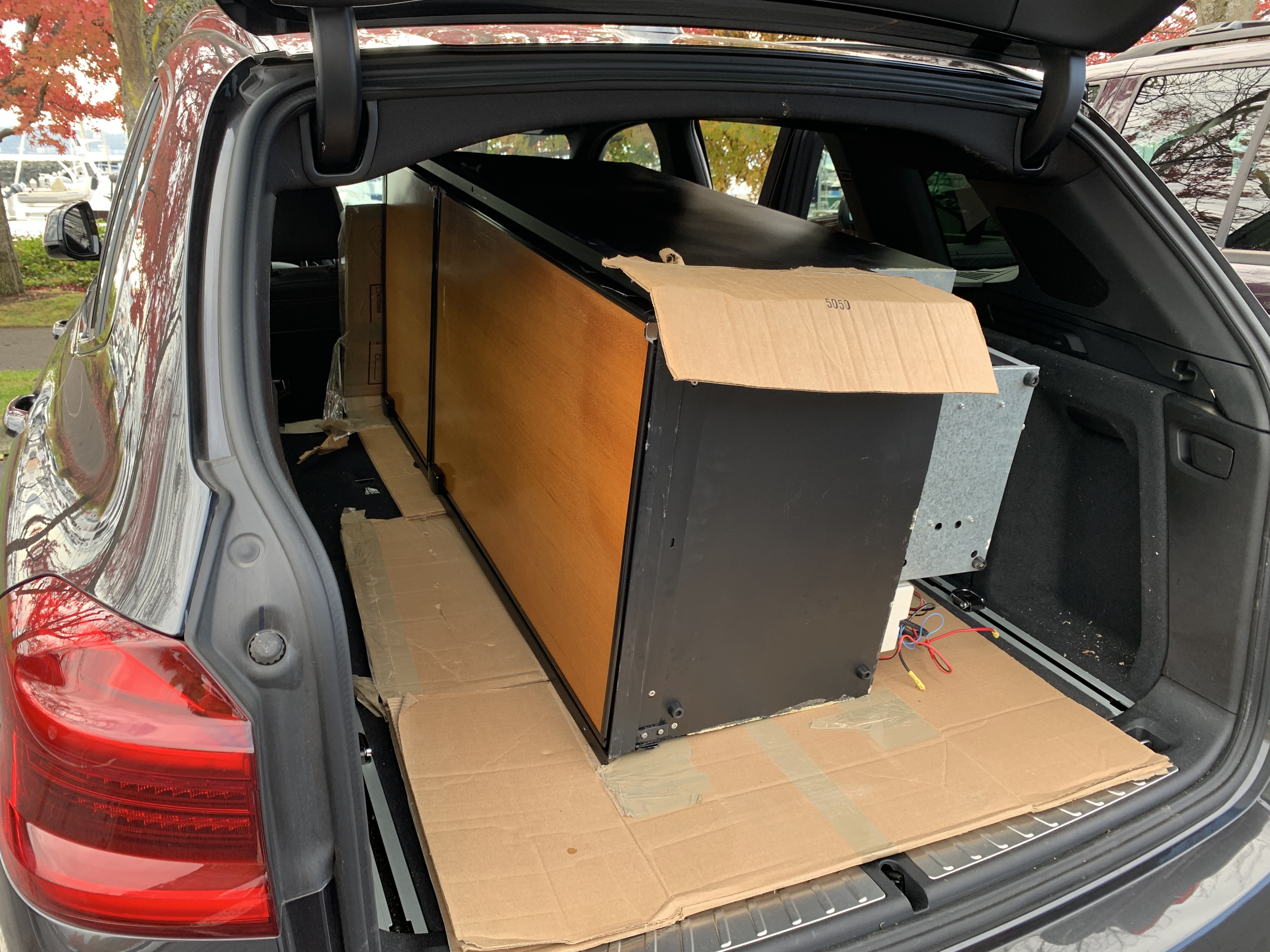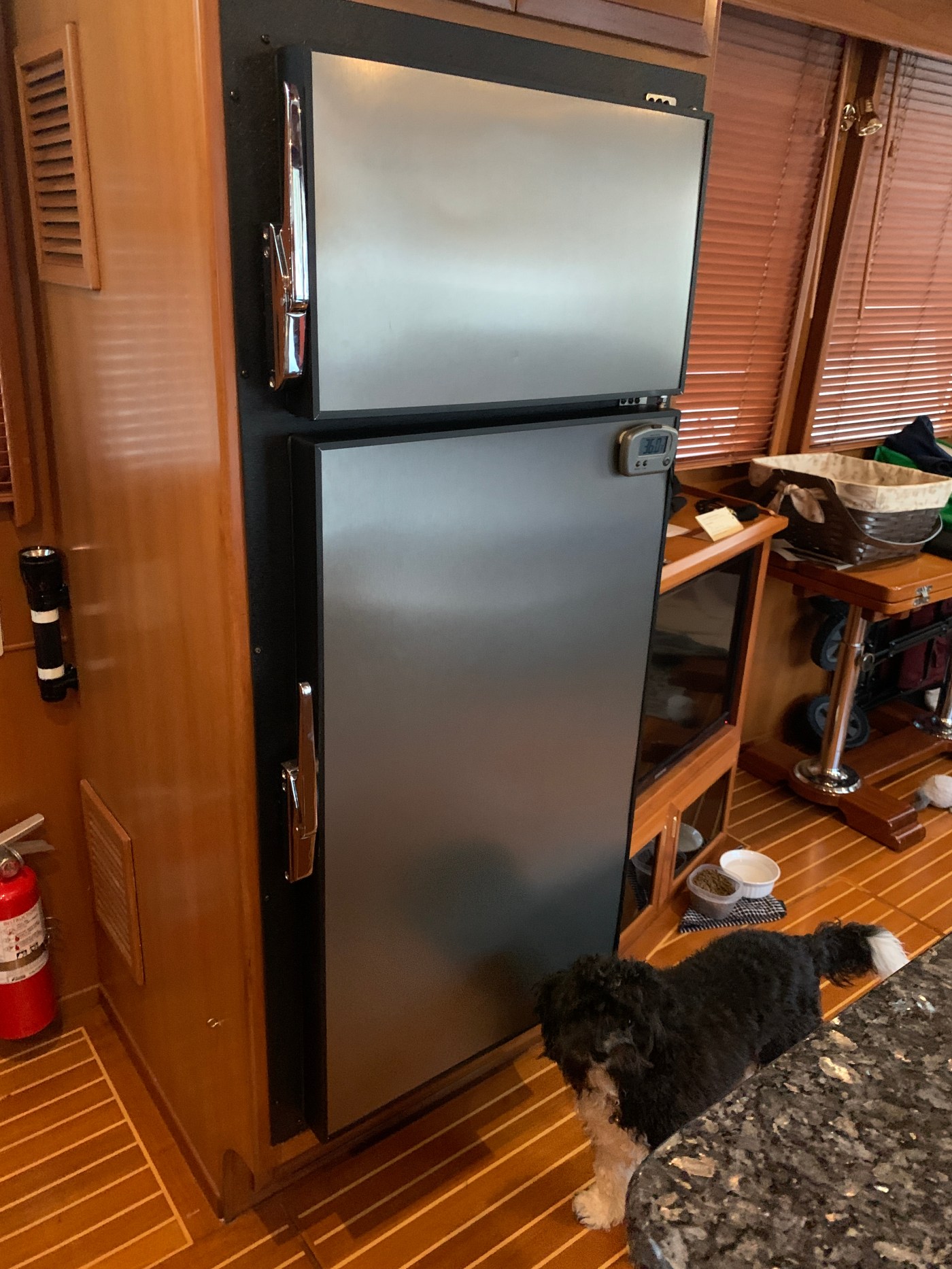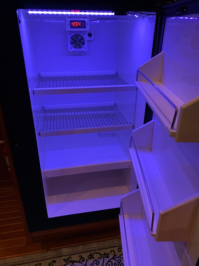 Then after a quick and uneventful trip to Bellingham to pick up the new Sea Freeze, I was ready for the installation and setup. The DC-only model requires that I simply connect two wires to the compressor. The Sea Freeze requires the same sized circuit breaker as the Dometic, although the new compressor is larger, so it was nice not to have to replace that. After checking to ensure it powered up, I slid it into the cabinet and fastened it in place. The compressor is controlled by a digital thermostat and it really cools down quickly. The well-insulated box prevents the ambient air temperature from adversely affecting the cooling. The old poorly insulated Dometic would struggle to stay cool when the ambient temperature in the cabin was over 60 degrees. One feature that I wish was offered is an external readout of the internal temperature. I solved that by mounting one on the door with a wired sensor fastened inside. It works fine for now. I am very happy with the overall installation and the refrigerator’s performance. Here are some pictures:
