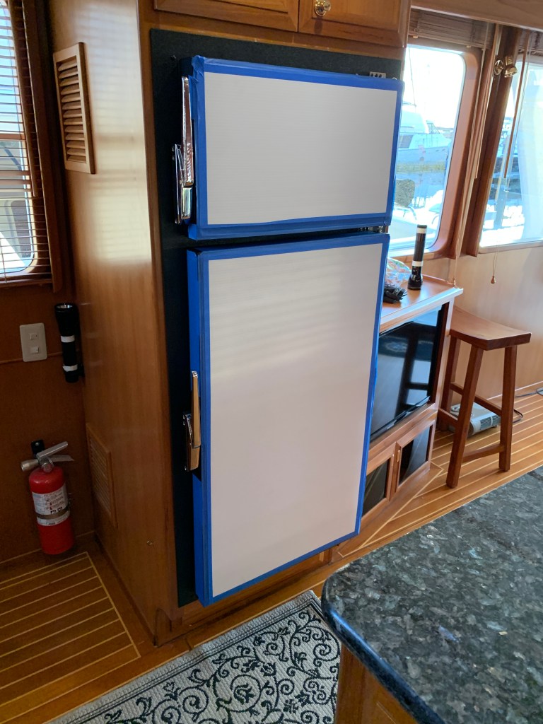 Fiddler’s original refrigerator is a Dometic AC/DC model with 8.5 cubic feet of interior volume. The problems began when the door gaskets failed, causing cool air loss, rapid build up of frost in the freezer, and continuous cycling. I searched for a replacement gasket and found that they are not offered separately and an entire new door must be purchased. Instead of falling for that scam, I went to Home Depot and found some material for sealing windows and doors which worked fairly well, but still did not adequately seal the doors. But this extended its life for a couple of years and I endured the frequent defrosting. The interior light never worked either. Then the AC converter failed and I started searching for a replacement.