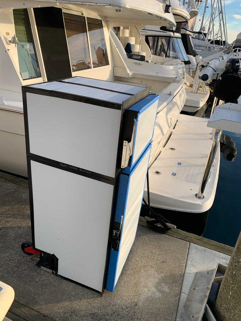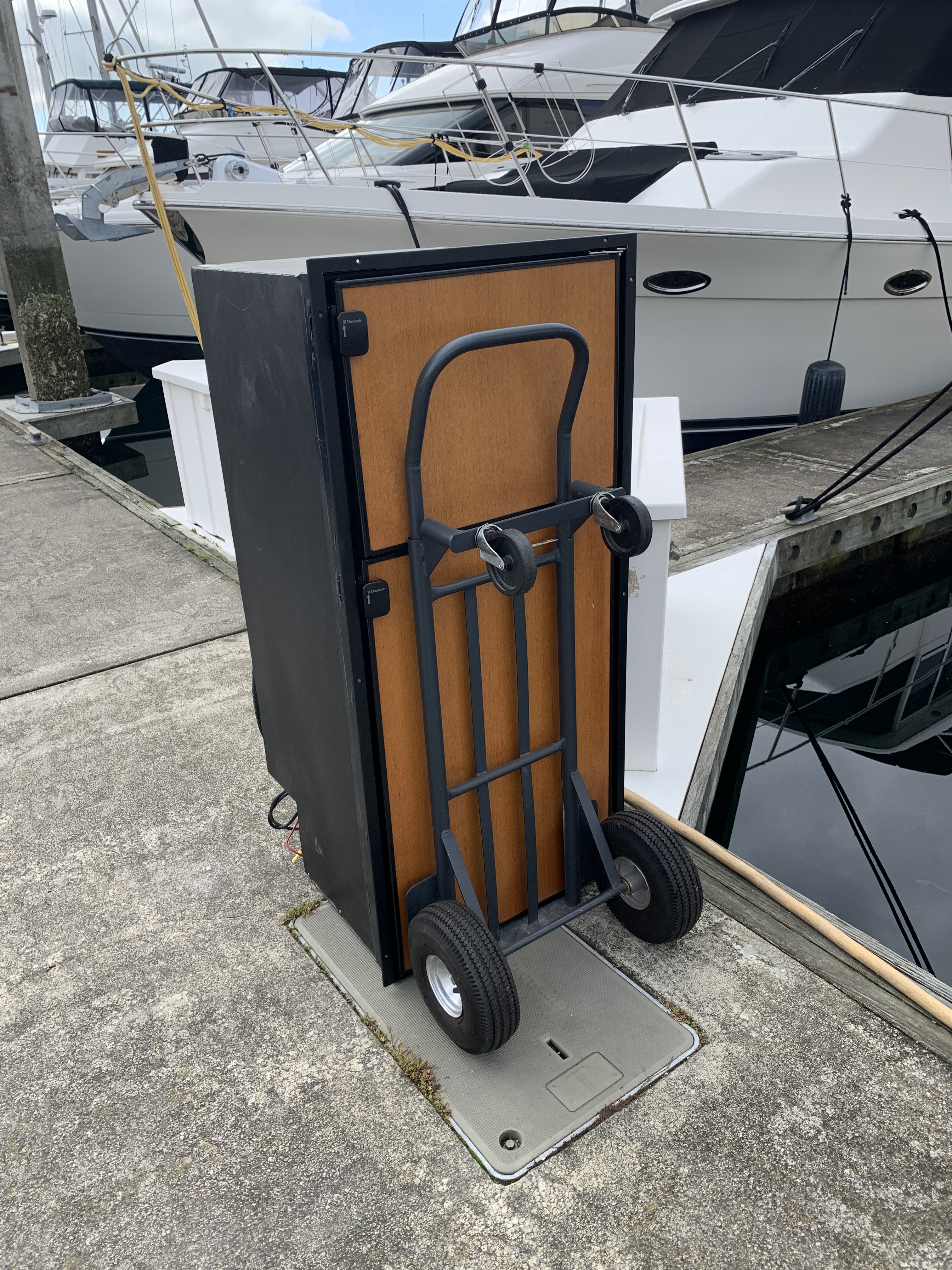 With the help of a friend, we removed the Dometic and delivered it to the local dump for which I happily paid the $35 fee. It weighs around 100 pounds but the size makes it unwieldy in close quarter maneuvering on a boat. Fortunately no damage was done to Fiddler in the process, or to my back.